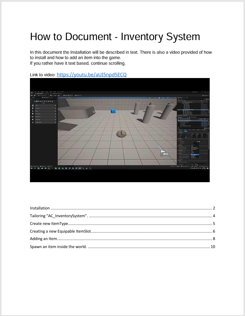 As part of the design process for this RPG Inventory System, I created a comprehensive “How-To” Document to ensure the ease of use of the implementation. This document was designed in a way so it was easy to follow and understand, giving examples and step-by-step instructions. That was done in written form and an optional video tutorial.