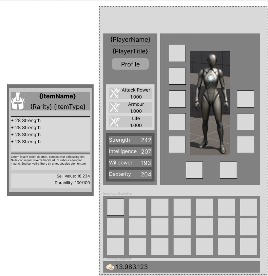 I designed this wireframe as a concept for an RPG Inventory System. It is structured in a way to provide a clear structure for the player so it is easy to view their stats, and manage their equipment. The design prioritizes an ease of use where the player can quickly understand their current state and make informed decisions without having to open additional windows.